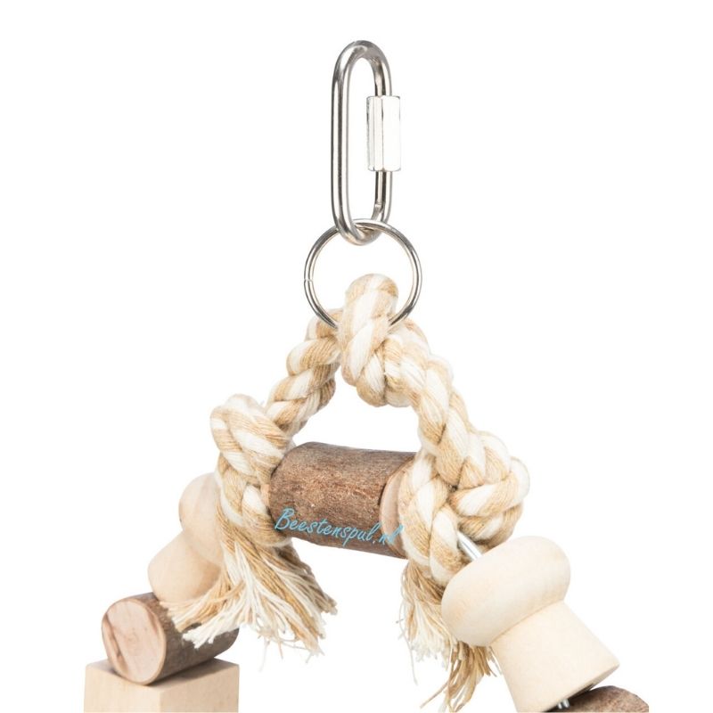Een boogschommel voor vogels, gemaakt van natuurlijk hout, is een ideaal speeltje voor in de vogelkooi.