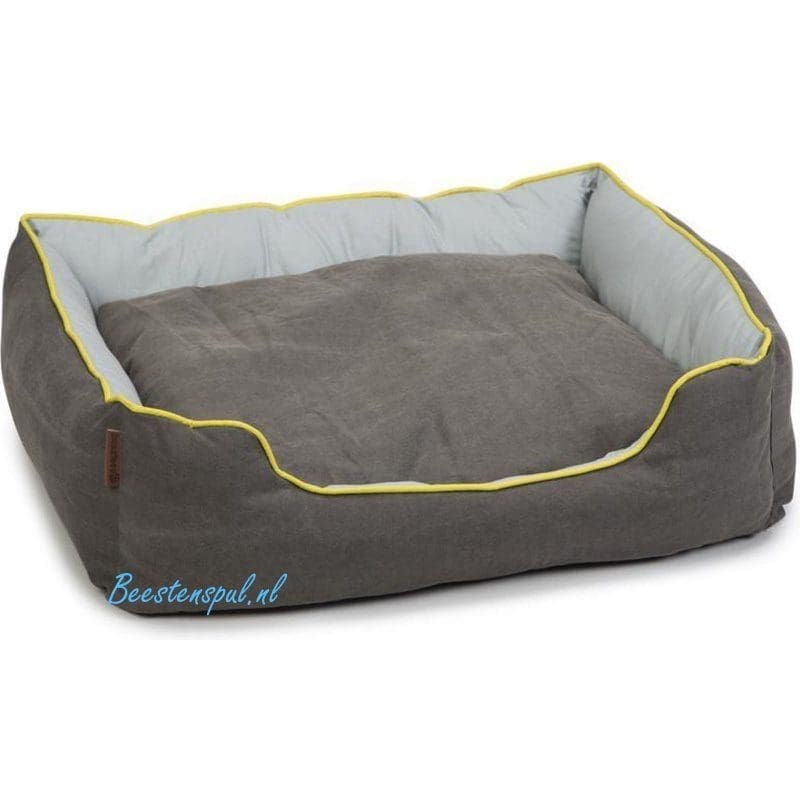 Hij heeft zachte opstaande randen afgewerkt met een geel randje en een uitneembaar kussen, hierdoor zal uw hond extra comfortabel liggen.