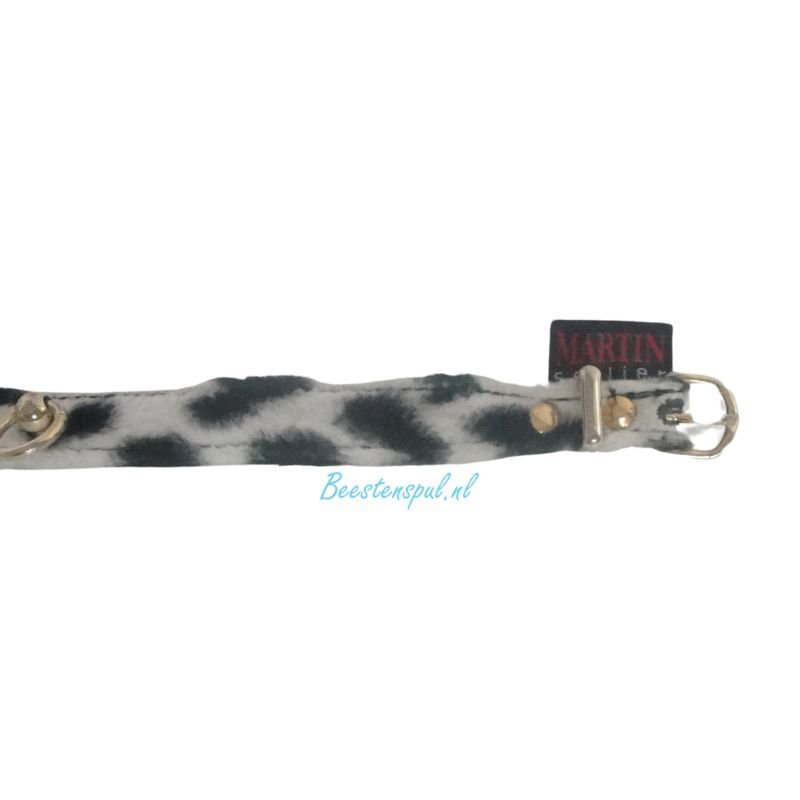 Taps toelopende halsband met een koeien print afgewerkt met goudkleurige details.