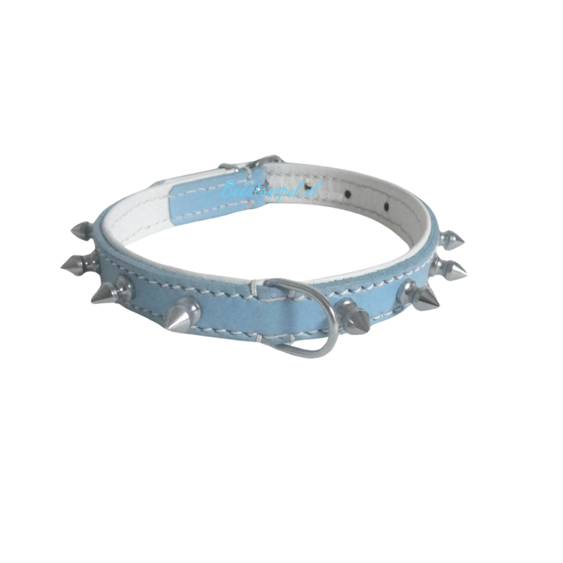 Stoere, maar speelse met wit leder gevoerde halsband met spikes van 6 mm hoog.
