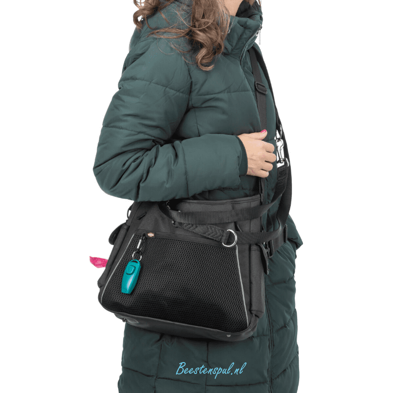 Aan de D-ringen bevestig je eenvoudig een hondenfluitje, een clicker, etc.